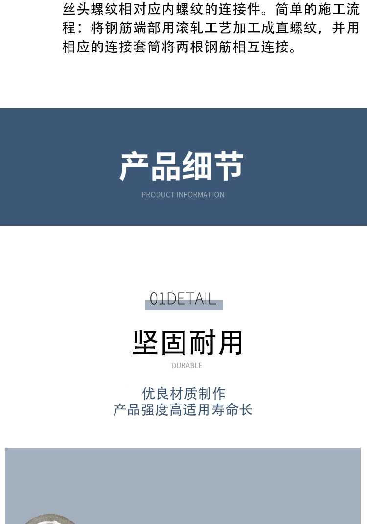 鋼筋套筒又名鋼筋接頭:用以連接鋼筋且具有與絲頭螺紋相對(duì)應(yīng)內(nèi)螺紋的連接件。簡(jiǎn)單的施工流程:將鋼筋端部用滾軋工藝加工成直螺紋,并用相應(yīng)的連接套筒將兩根鋼筋相互連接。鋼筋套筒通常是用精密鋼管進(jìn)行生產(chǎn)的。專門用于生產(chǎn)鋼筋套筒的精密鋼管采用的是45#鋼材,通常又被稱為“鋼筋連接套管”。鋼筋套筒***可靠,連接方便,便于檢測(cè)。