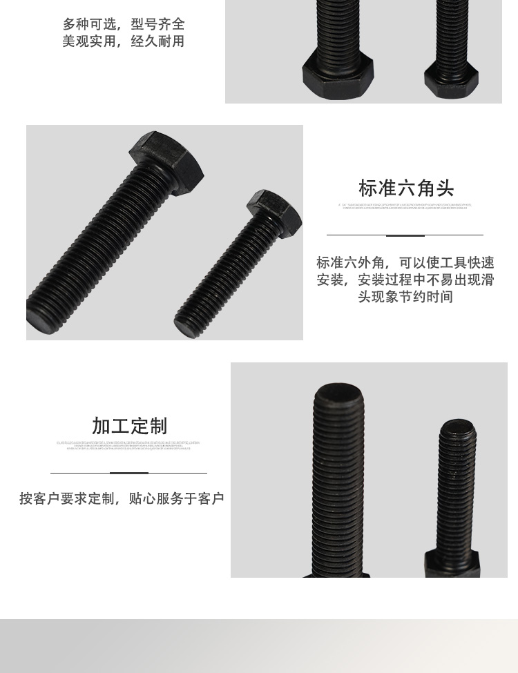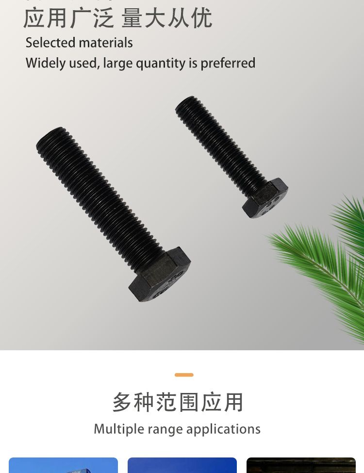 高強度螺栓主要用于工業與民用建筑、鐵路橋梁、公路橋梁、管道橋梁、塔桅結構、鍋爐框架、鍋爐鋼結構、大跨度工業廠房、高層民用建筑、各種塔架、輕型鋼結構、起重機械及其他鋼結構連接建筑的建設。