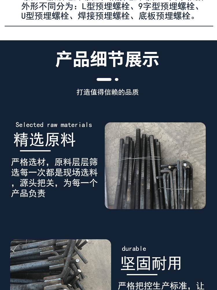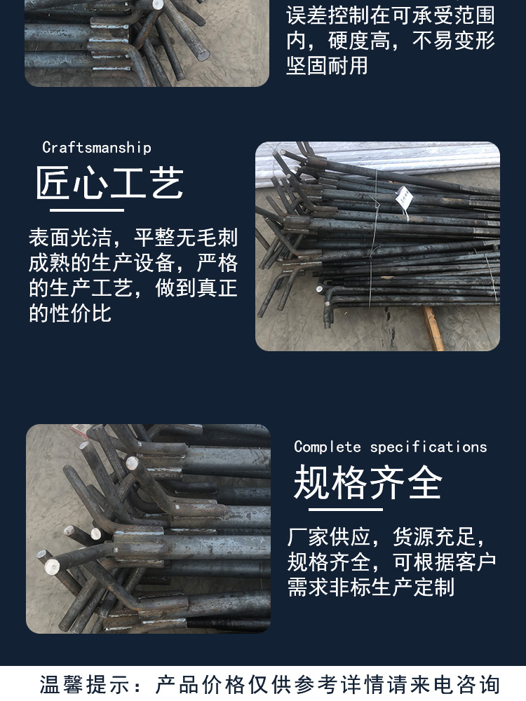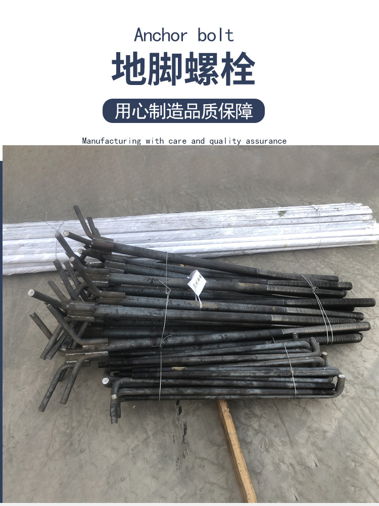 地腳螺栓一般用Q235鋼,即為光圓的。地腳螺栓可分為固定地腳螺栓、活動地腳螺栓、脹錨地腳螺栓和粘接地腳螺栓。其中根據(jù)外形不同分為:L型預埋螺栓、9字型預埋螺栓、U型預埋螺栓、焊接預埋螺栓、底板預埋螺栓。應用行業(yè):適用于各種設備固定、鋼結構基礎預埋件、路燈、交通指示牌、泵、鍋爐安裝、重型設備預埋固定等。